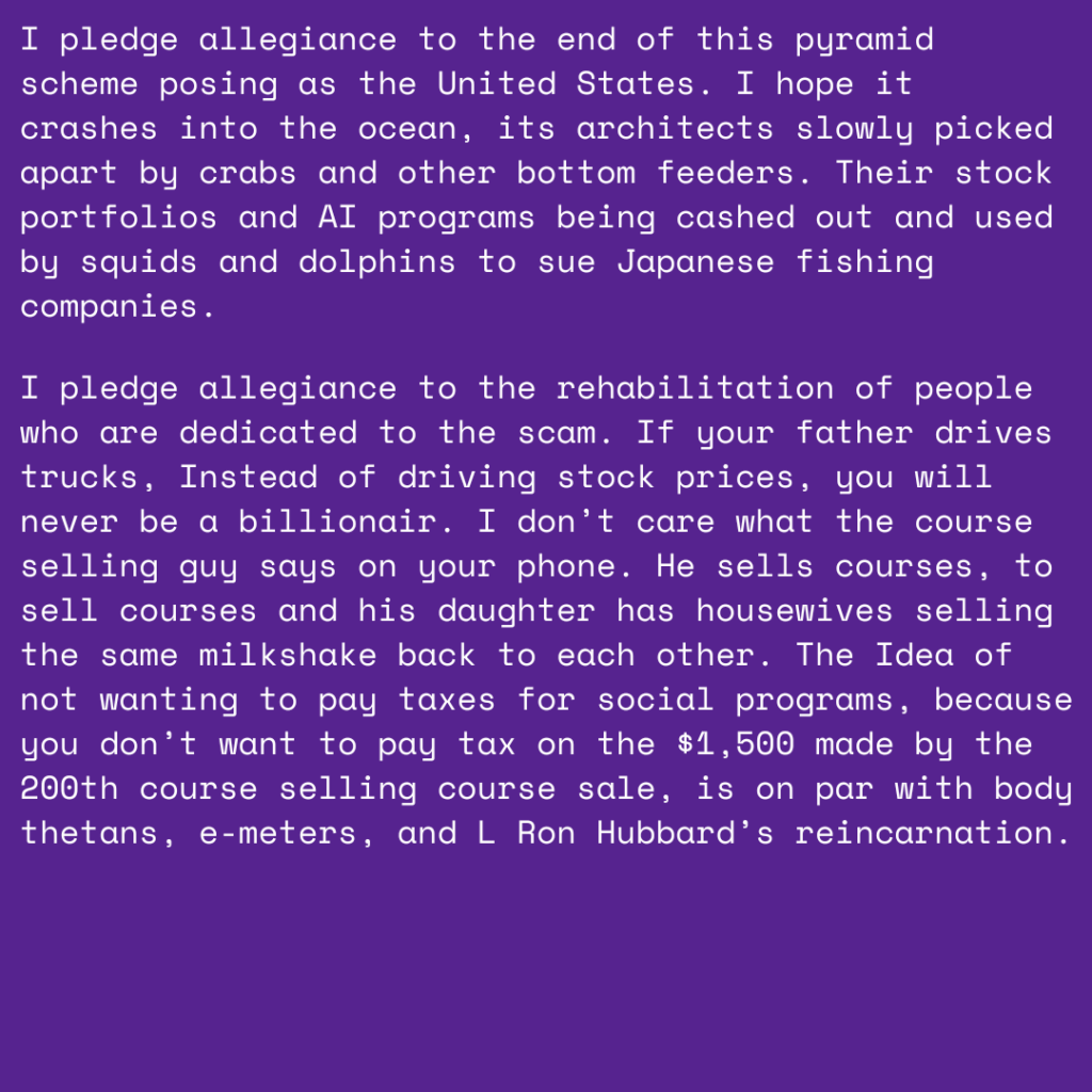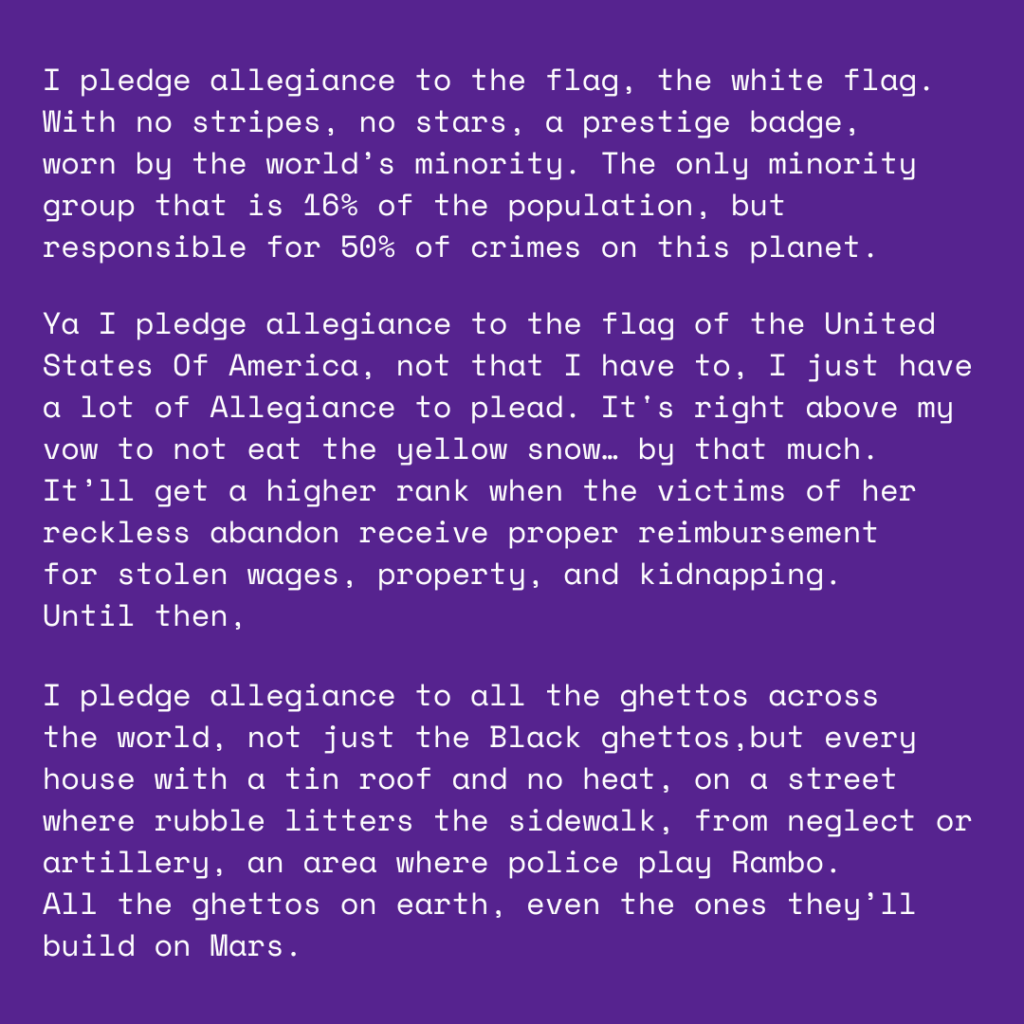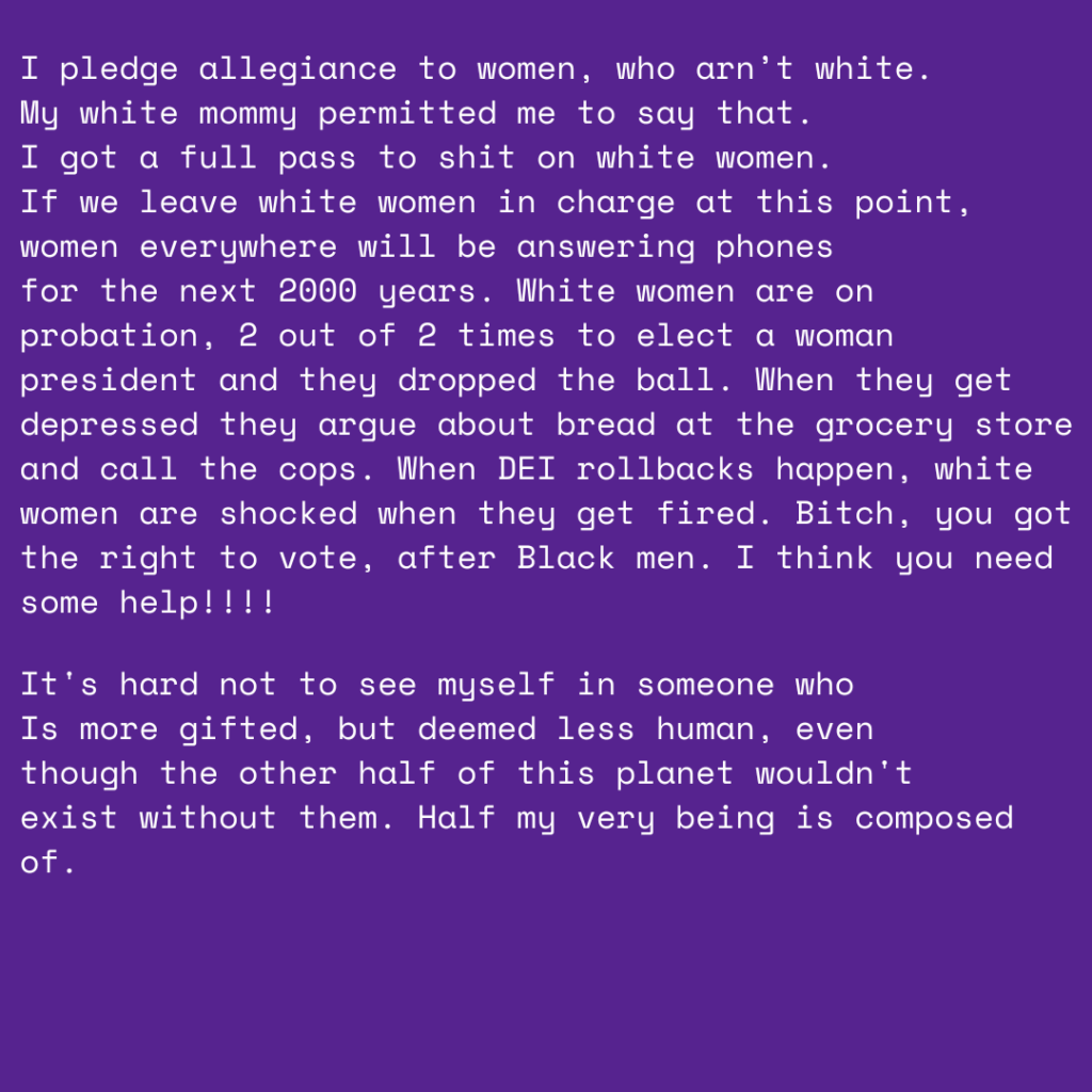 On July 4th of last year, I saw a clip of Charles Mingus giving a powerful quote about the Pledge of Allegiance and what he pledges allegiance to on my Instagram feed. I knew it was something that I just had to keep in my back pocket. As the year ran down and our political landscape began to reveal the scarred face of White Supremacy once again, the Jazz great’s words only rang louder. Going into 2025, I restarted my interest in open mic nights/poetry events. What I admire most about the Seattle poetry slam community is that its best and brightest have a quiver full of statements that speak directly to the soul of America’s many habits and contradictions.