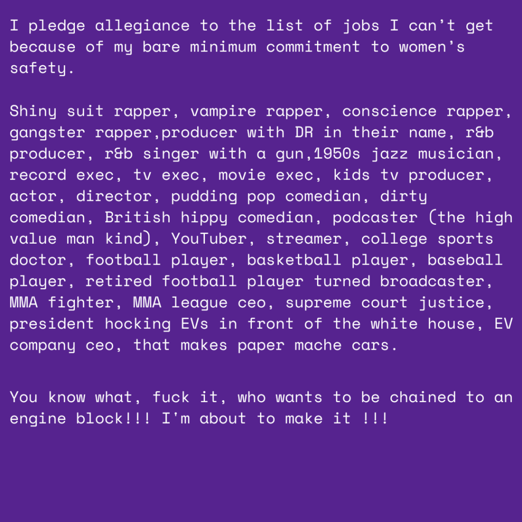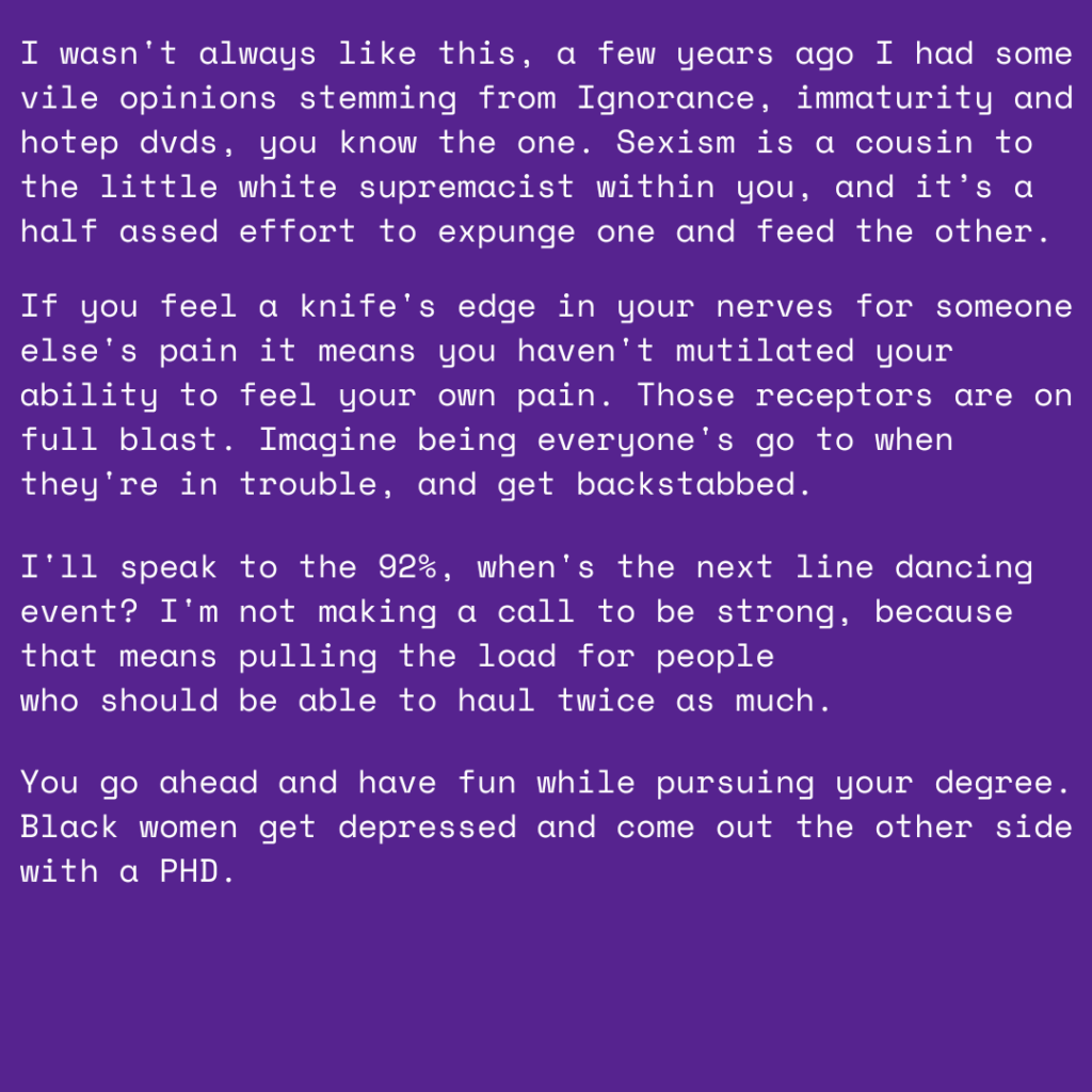 I also wanted to point the gun at myself, as a person living in an ill society, I acknowledge that my ideals towards women weren’t always right. Ideology similar to that of Umar Johnson, convinced me that women are not to be trusted when coming forward with their stories of mistreatment. I blindly followed faux pro black figures (hoteps) and cast judgment on Black women who did not yield to the idea that Black men are helpless babies and cannot oppress their female counterparts. After a while, I realized that I was thinking less like Malcolm X or Dr. King and more like Ben Shapiro, a racist who can’t get his wife wet in a bathtub. I had to shame all the evil men like Diddy on the list at the end, to exercise the little ghoul within me.