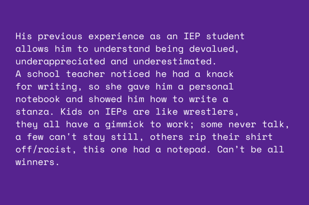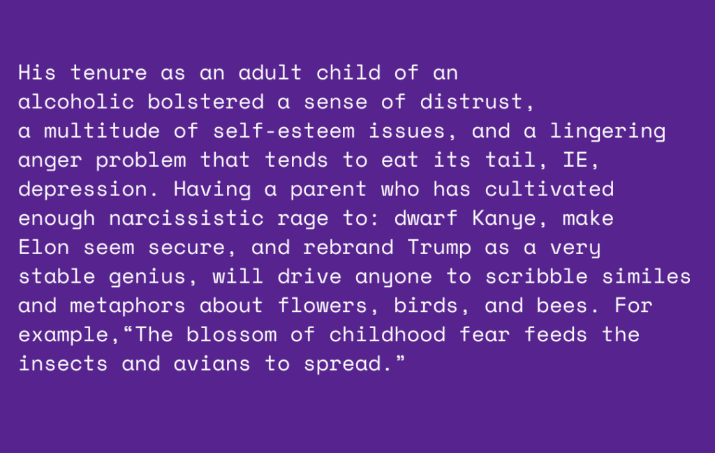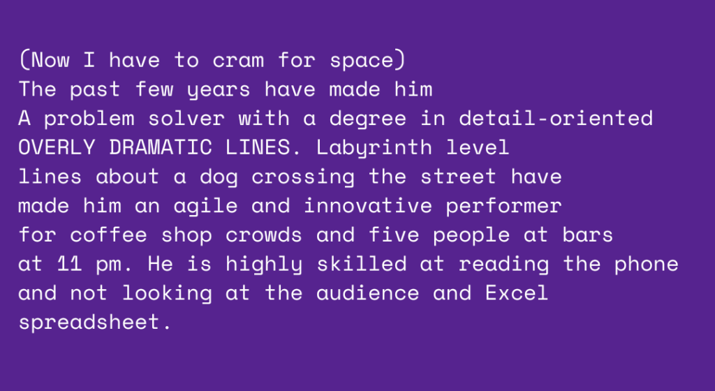 This poem came to be after I conducted a workshop for the Seattle nonprofit, Hugo House. They provide classes and resources for writers. The writing prompt was based on a poem that was laid out like a resume; unfortunately, I can’t remember the exact poem. However, the challenge was to write a poem that serves as a resume, explaining why you write and your experiences as a poet. I went on free resume tip sites and looked up keywords and cliches to avoid, and plugged them right in.